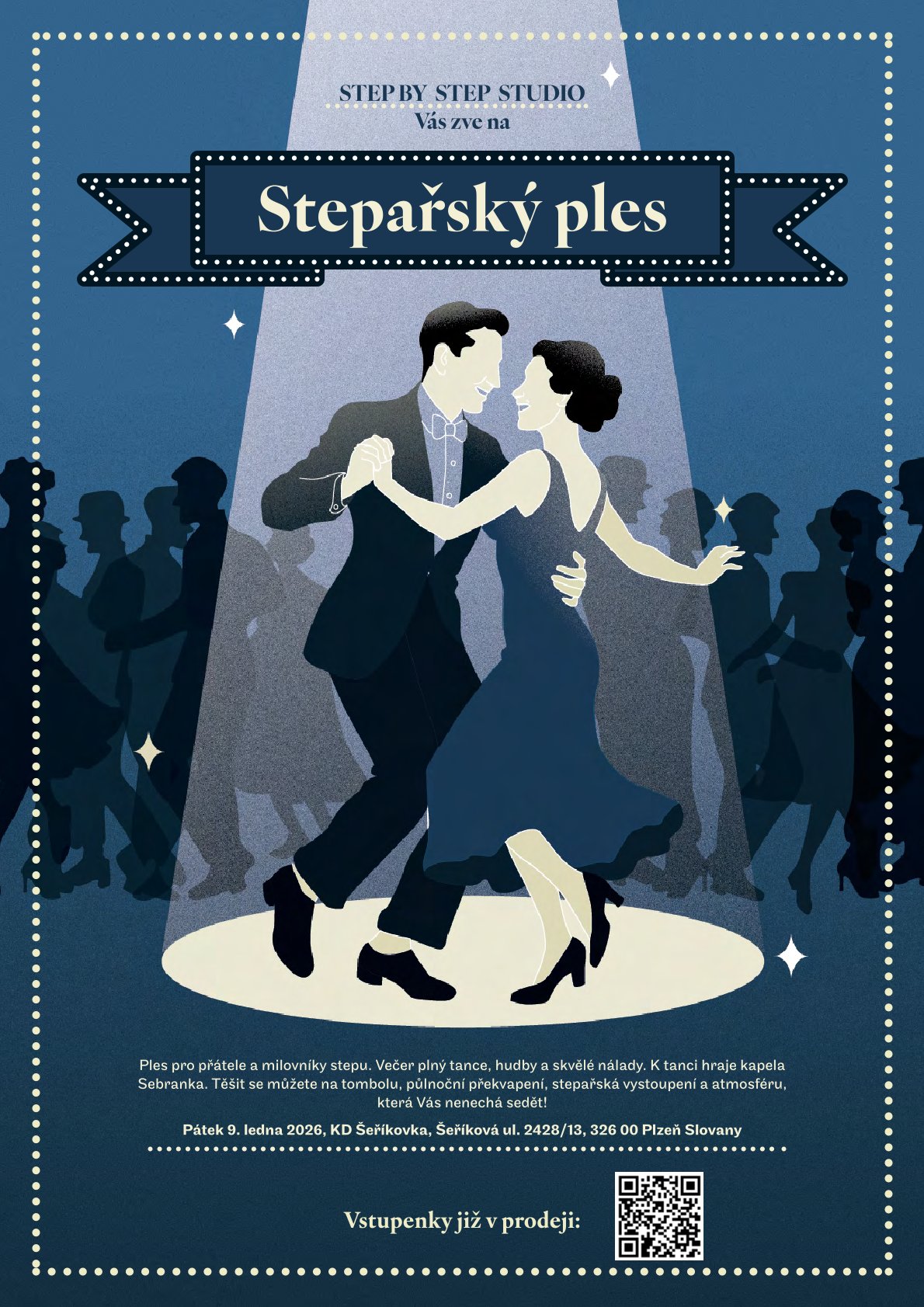 Přijďte si vychutnat večer plný rytmu, tance, hudby a setkání s přáteli. Ať už jste milovníci stepu, hudby, nebo jen chcete zažít příjemnou atmosféru plesu, těšíme se na vás!